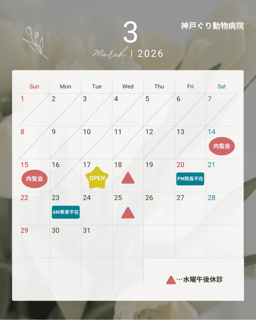 3月 獣医師出勤表 お知らせ 2026年3月5日 3月の獣医師出勤表です。●3/20(金祝)の午後は院長不在のため、希実獣医師のみの診察となります。●3/23(月)の午前は希実獣医師不在のため、院長のみの診察となります。よろしくお願いいたします。